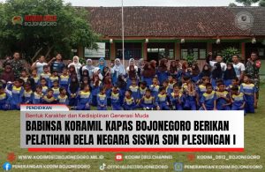 BOJONEGORO, – Komando Rayon Militer (Koramil) 02/Kapas Kodim 0813 Bojonegoro menurunkan 2 personel Bintara Pembina Desa atau Babinsa jajarannya untuk memberikan penguatan bela negara melalui pelatihan dasar bari-berbaris (PBB) dan materi Wawasan Kebangsaan (Wasbang) kepada para siswa dan siswi SD Negeri Plesungan I, Kamis (13/11/2025).
