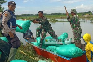 BOJONEGORO, –    Jajaran Babinsa Koramil 10/Kanor Kodim 0813 Bojonegoro, bersama anggota Bhabikamtibmas, BPBD, BBWS, perangkat desa dan masyarakat bergerak cepat melakukan perbaikan tanggul di Desa Kedungprimpen Kecamatan Kanor Kabupeten Bojonegoro yang jebol akibat tingginya debit air Kali Avour Ingas, serta meningkatnya elevasi tinggi muka air Sungai Bengawan Solo.