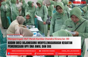 BOJONEGORO, –    Dalam rangka memperingati Hari Ulang Tahun (HUT) Persit Kartika Chandra Kirana (KCK) ke- 80, Kodim 0813 Bojonegoro menyelenggarakan kegiatan pemeriksaan Elektrokardiogram (EKG) dan HPV DNA awal di Aula Ahmad Yani Markas Kodim setempat, Rabu (11/2/2026).