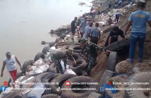 BOJONEGORO, – Masih adanya hujan dengan intensitas tinggi di musim kemarau, membuat debit air Sungai Bengawan Solo kerap turun naik. Hal ini membuat tanah di sepanjang aliran Sungai Bengawan Solo yang melewati Desa Banjarjo Kecamatan Padangan Kabupaten Bojonegoro menjadi rawan longsor akibat abrasi arus sungai terpanjang di Pulau Jawa tersebut.
